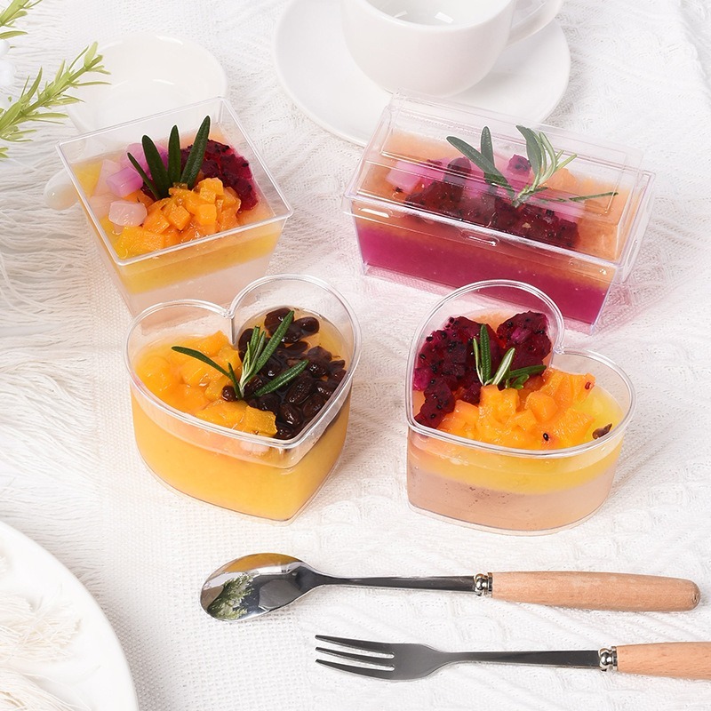 Cốc Nhựa Trái Tim Đựng Bánh Lạnh mang lại sự khác biệt cho các tiệm bánh và quán cà phê muốn tạo dấu ấn riêng. Nhờ thiết kế trái tim tinh tế, chiếc cốc giúp món bánh mousse, tiramisu hay sữa chua dẻo trở nên sinh động và đầy cảm xúc. Không chỉ là vật chứa, cốc còn đóng vai trò như một phần của nghệ thuật trình bày, khiến quầy bánh thêm nổi bật và hấp dẫn hơn trong mắt khách hàng.