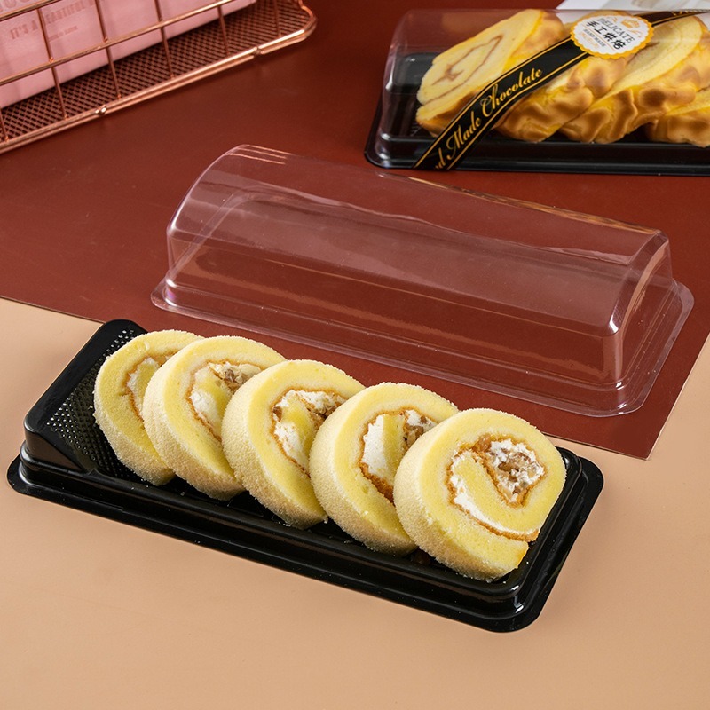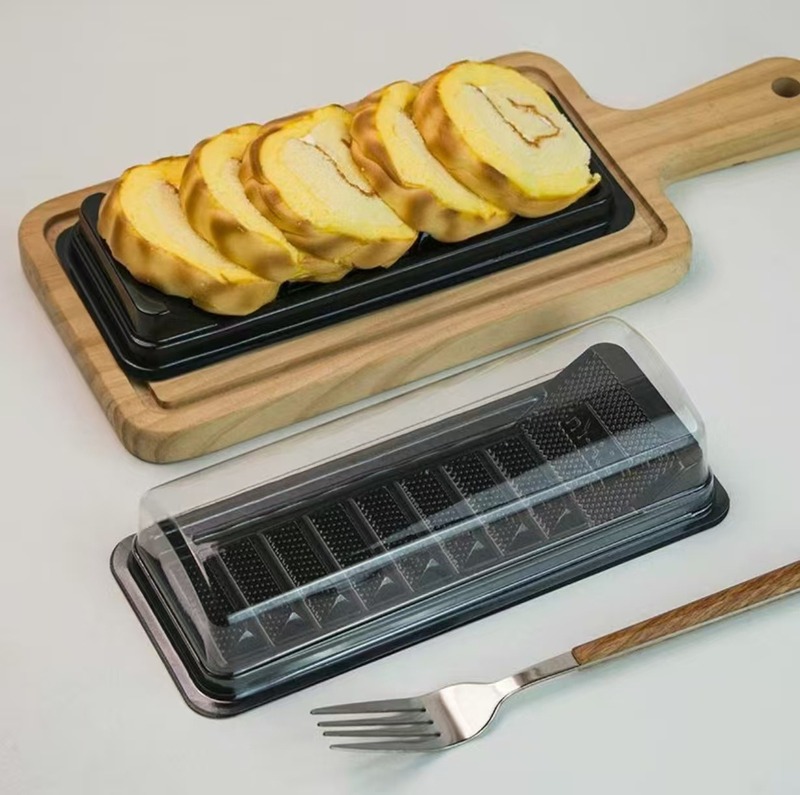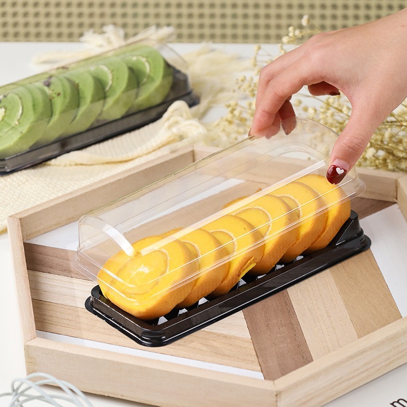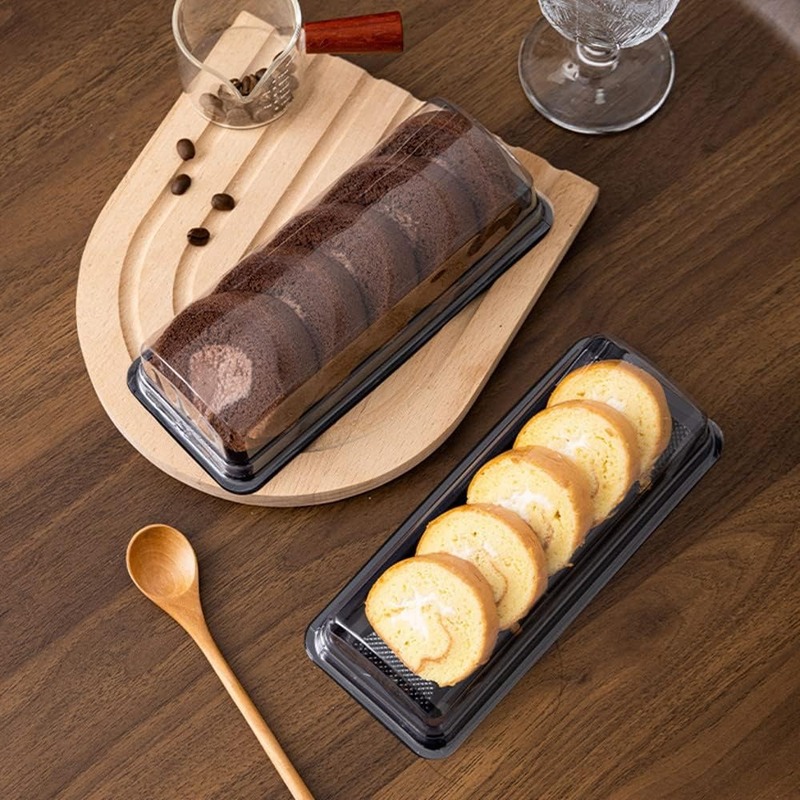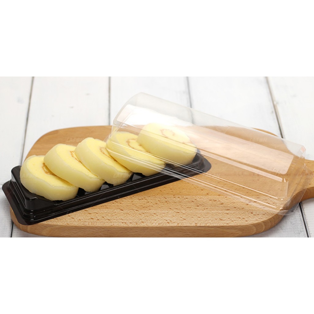 Hộp A24 (A04) được thiết kế chuyên dụng cho bánh bông lan cuộn cắt lát, giúp lát bánh đứng vững và giữ nguyên form xoáy đặc trưng. Phần bậc thang nâng bánh lên tạo cảm giác đầy đặn, đẹp mắt khi trưng bày tại quầy. Nhờ nắp trong suốt, bánh được hiển thị rõ nét, phù hợp cho các tiệm bánh chú trọng hình ảnh sản phẩm. Đây là ứng dụng phổ biến nhất của hộp trong các mô hình kinh doanh bánh hiện nay.