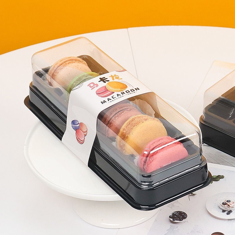 - Chất liệu: Nhựa PET trong suốt, an toàn khi tiếp xúc thực phẩm, không gây mùi và có độ cứng cáp cao. PET giúp nắp hộp trong veo, làm nổi bật màu sắc và kết cấu bánh bên trong.
