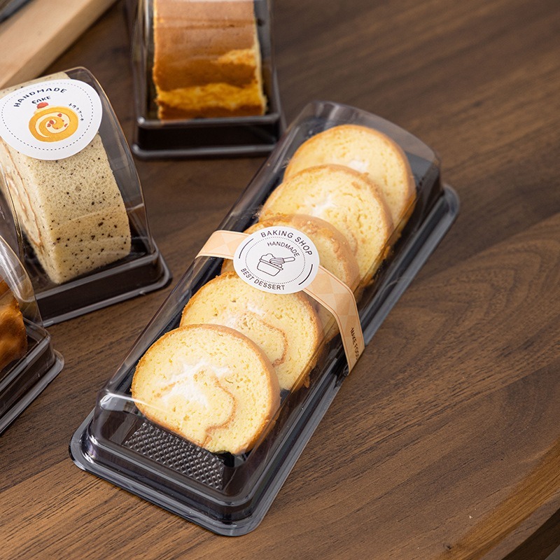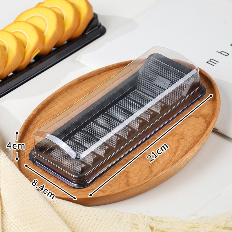 - Kích thước: 21 × 8.5 × 4 cm – thiết kế dạng bậc thang giúp lát bánh bông lan đứng vững, giữ form đẹp khi trưng bày hoặc giao hàng. Kích thước dài phù hợp cho các lát bánh lớn hoặc bánh có topping.