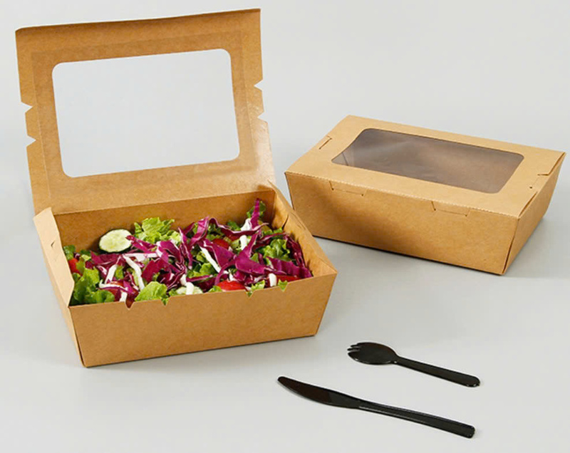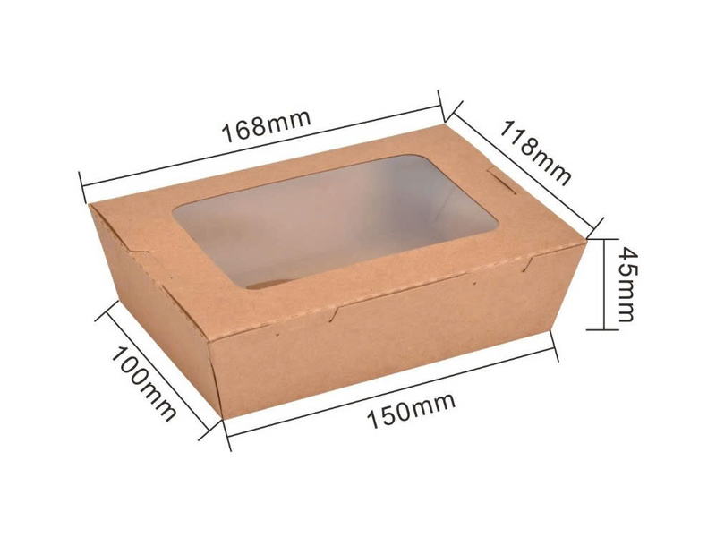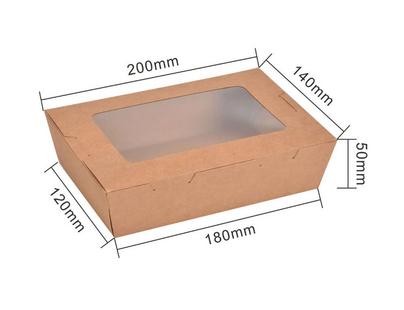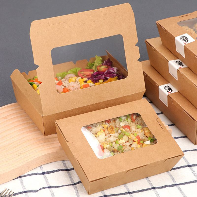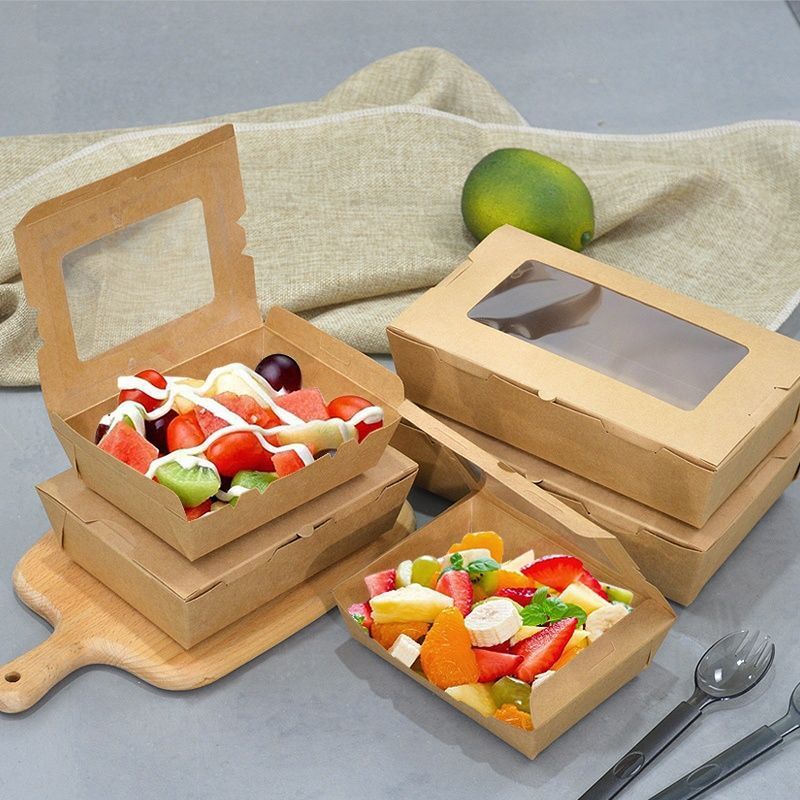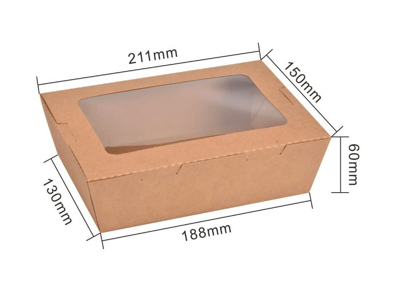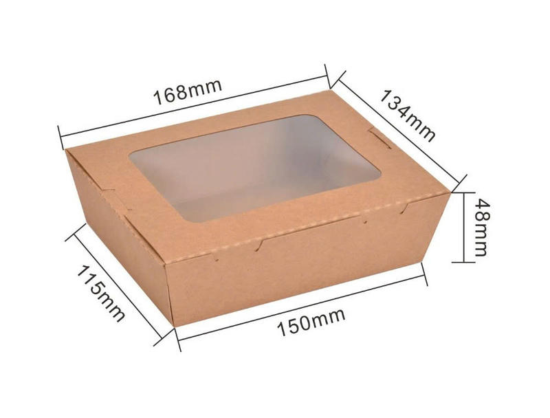 Cửa sổ bóng kính hỗ trợ hiển thị màu sắc tươi sáng của salad hay trái cây cắt miếng, giúp món ăn trông bắt mắt và dễ bán hơn. Hộp Kraft có khả năng chịu ẩm nhẹ nên phù hợp cho các món có sốt vừa phải hoặc độ ẩm thấp. Nhờ sự thông thoáng và chất liệu thân thiện môi trường, hộp đặc biệt được ưa chuộng trong các quán ăn healthy, eat-clean. Hộp nhẹ, dễ cầm và an toàn với thực phẩm lạnh hoặc mát. Đây là dòng bao bì giúp nâng tầm trải nghiệm cho khách hàng theo đuổi lối sống lành mạnh.