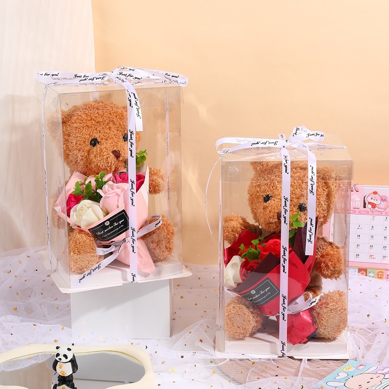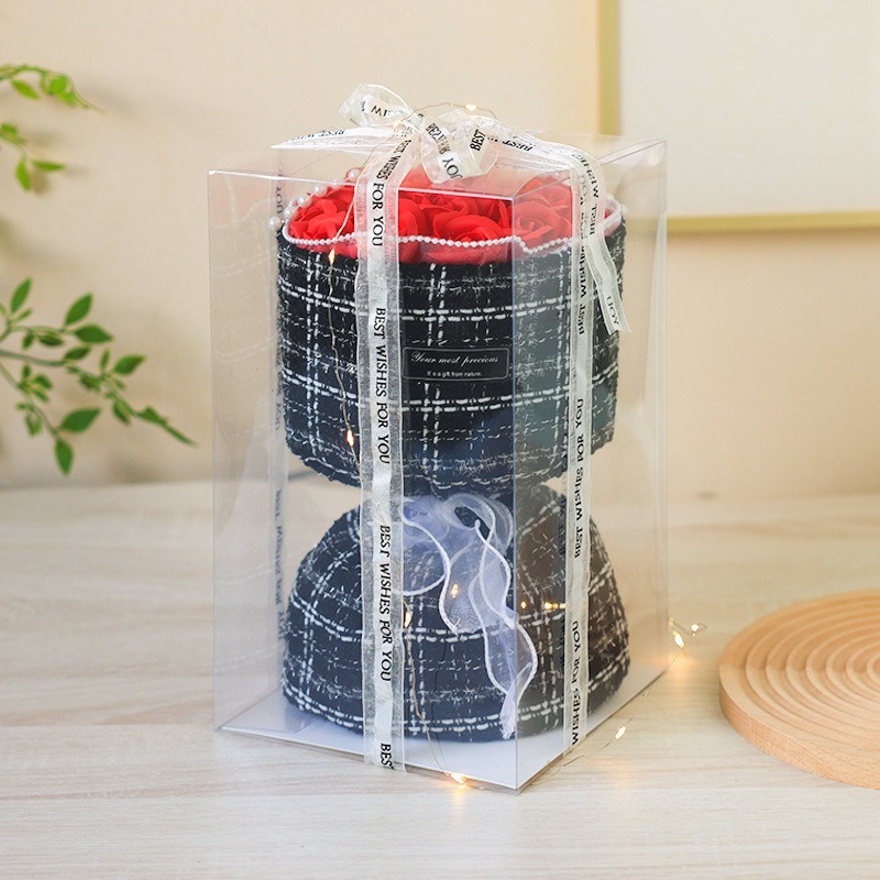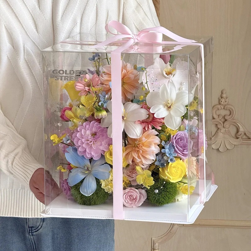- Kiểu dáng: Thiết kế hộp vuông trong suốt hiện đại, dễ đóng mở và trưng bày sản phẩm chuyên nghiệp. Có thể kết hợp trang trí nơ, tag hoặc hoa để tăng tính thẩm mỹ cho món quà.