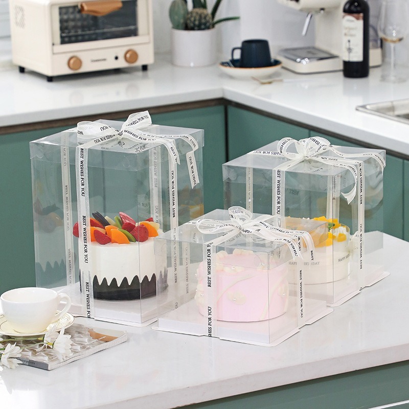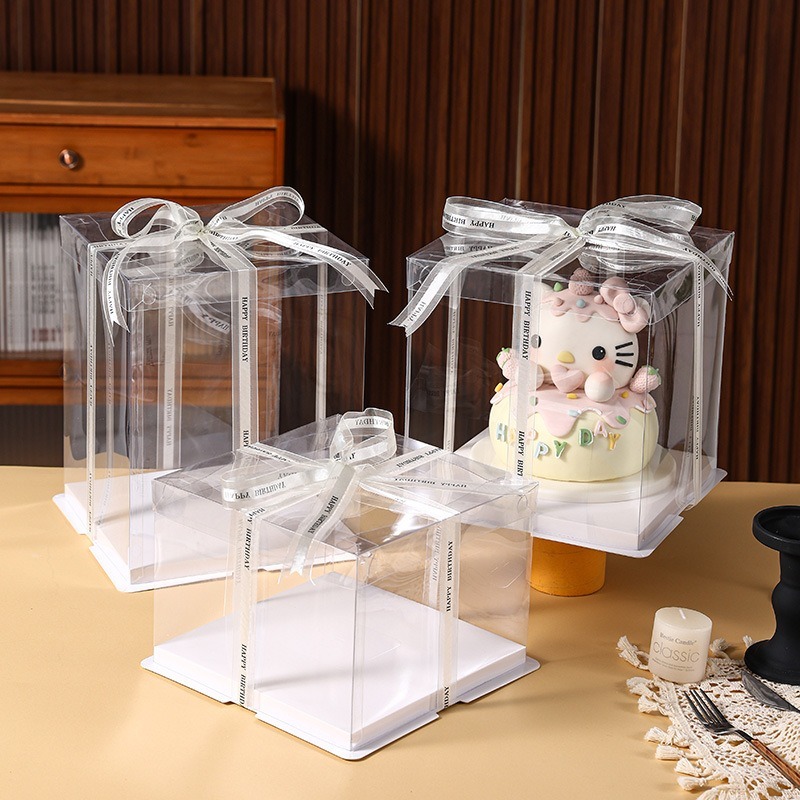 - Chất liệu: Thân hộp làm từ mica trong suốt cao cấp, có màng chống xước giữ độ bóng đẹp lâu dài. Nắp và đế giấy bồi xốp cứng cáp, nhẹ và an toàn khi đựng bánh kem hoặc quà tặng.