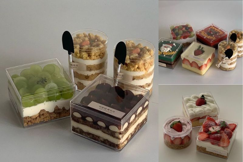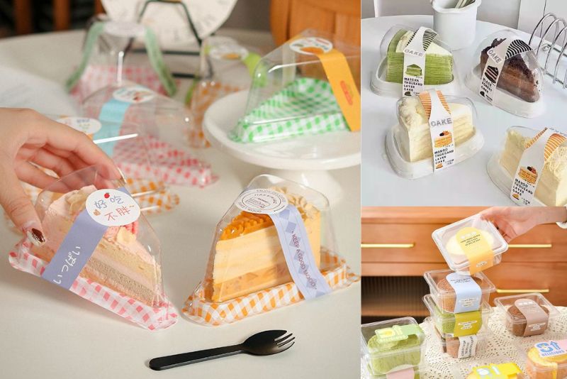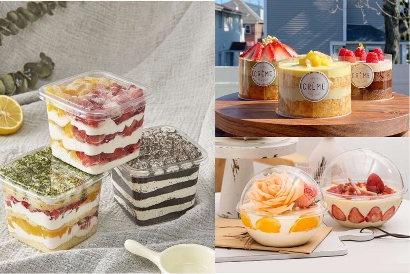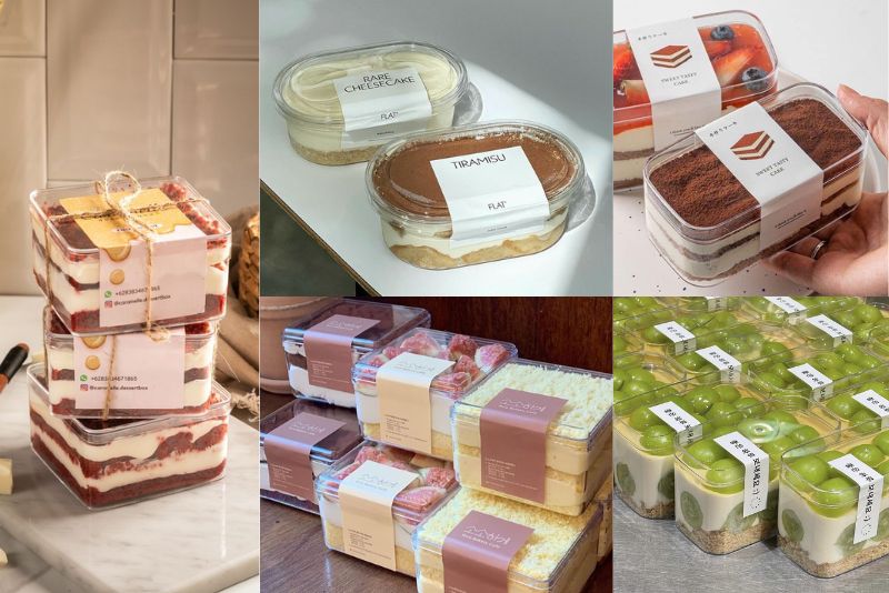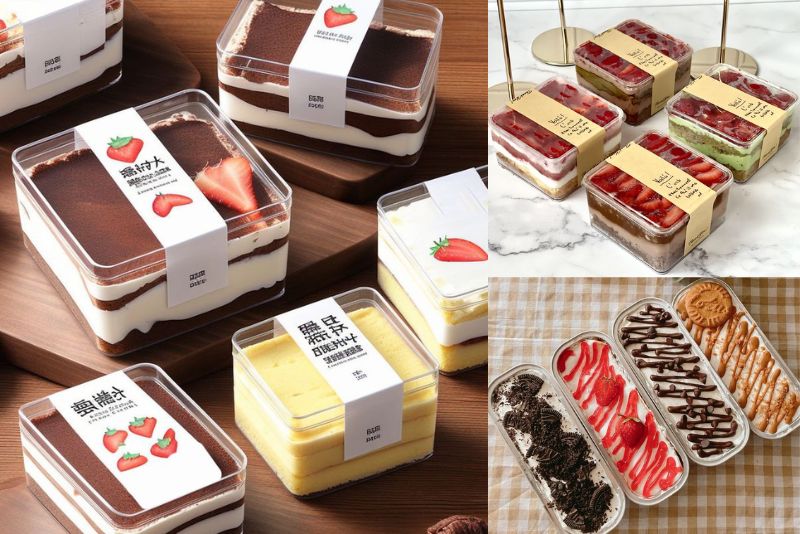 Hộp vuông hoặc chữ nhật: Thích hợp cho tiramisu, bánh gato hoặc sandwich, dễ xếp chồng, tiện lợi khi trưng bày hoặc bán theo phần.