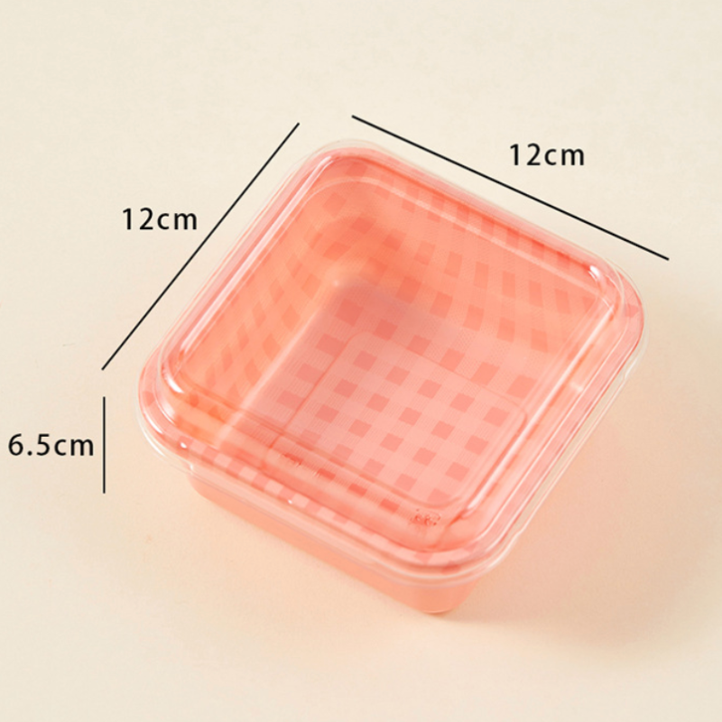 - Kích thước: 12 x 12 x 6.5 cm, đáy 9 x 9 cm, kích thước chuẩn cho các loại bánh nhỏ, bánh bento hoặc trái cây mini. Hộp có độ cao vừa phải, dễ xếp gọn và thuận tiện cho việc vận chuyển.